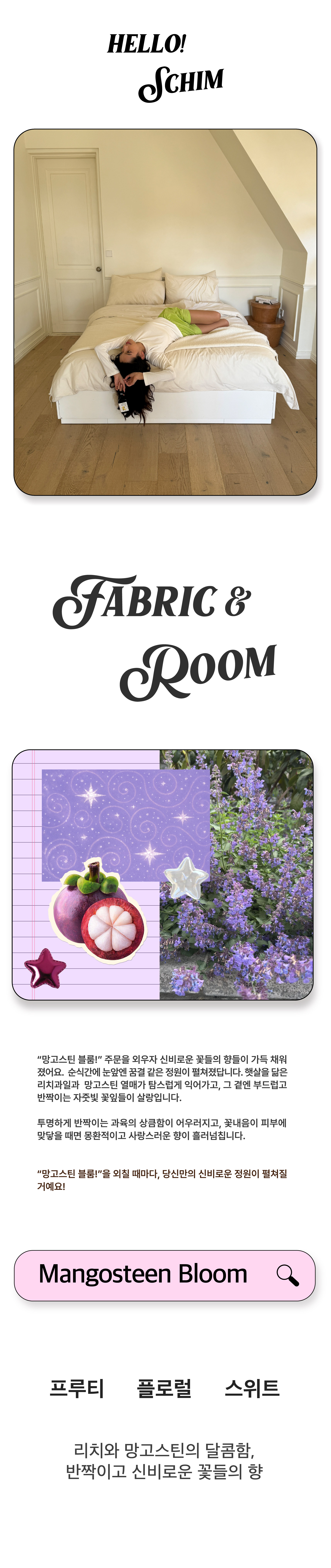 투명하게 반짝이는 과육의 상큼함이 어우러지고, 꽃내음이 피부에 맞닿을때면 몽환적이고 사랑스러운 향이 흘러 넘칩니다.